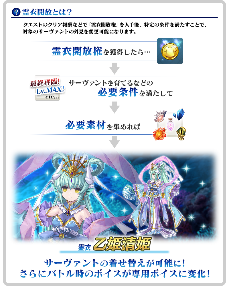 ※「★3(R)清姫(バーサーカー)」の霊衣開放権は、期間限定イベント「踊るドラゴン・キャッスル! ~深海の姫君とふたつの宝玉~」のイベントアイテム交換期間のみ入手可能です。