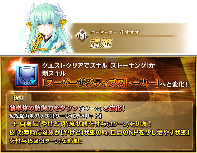 ※「★3(R)清姫(バーサーカー)」の霊衣は、外見とともに一部ボイスが変化します。