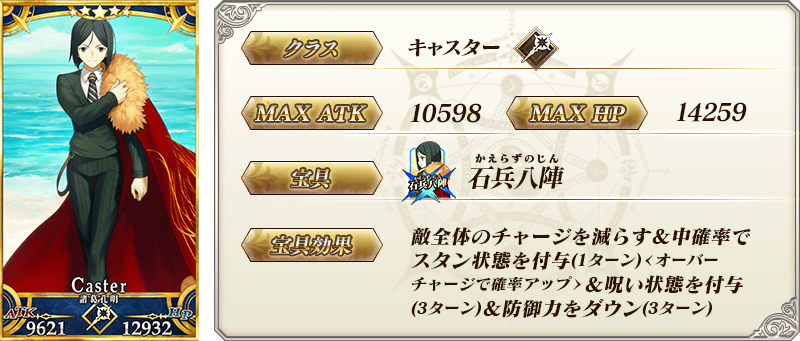 ※上記の「★5(SSR)諸葛孔明〔エルメロイⅡ世〕」のイラストとセイントグラフは霊基再臨第3段階のものです。