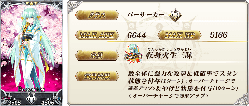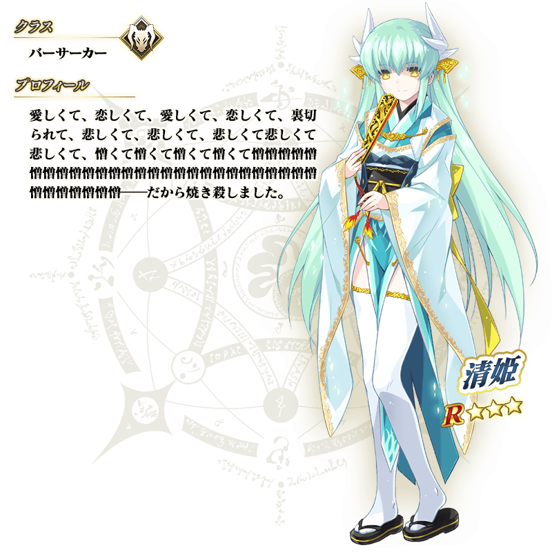 ※上記の「★3(R)清姫(バーサーカー)」のイラストとセイントグラフは霊基再臨第2段階のものです。