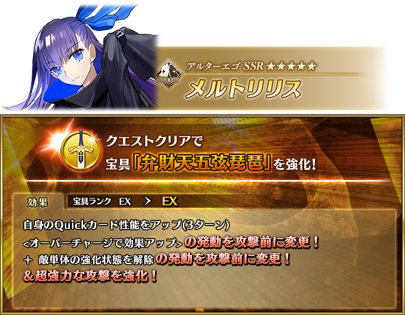 ※「★5(SSR)メルトリリス」は3つ目の強化クエストである「強化クエスト メルトリリス 3」をクリアする必要があります。 ※サーヴァント強化クエストにはアドベンチャーパートはありませんのでご注意ください。 ※対象サーヴァントを所持していない場合、クエストは出現しません。 ※クエストに開催期限はありません。