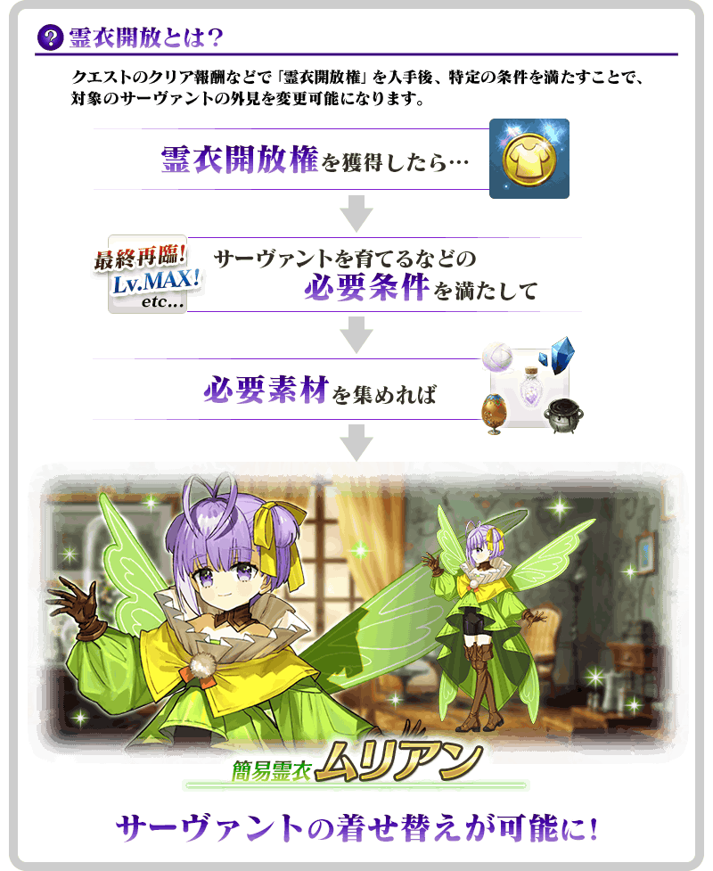 ※「霊衣開放」後は自動でバトルキャラやフェイス画像が切り替わります。「霊衣開放」前の状態に戻したい場合や、他の再臨段階に変更したい場合は、サーヴァント詳細画面より変更することができます。 ※「霊衣開放」をおこなってもクラスやパラメータなどに変化はありません。