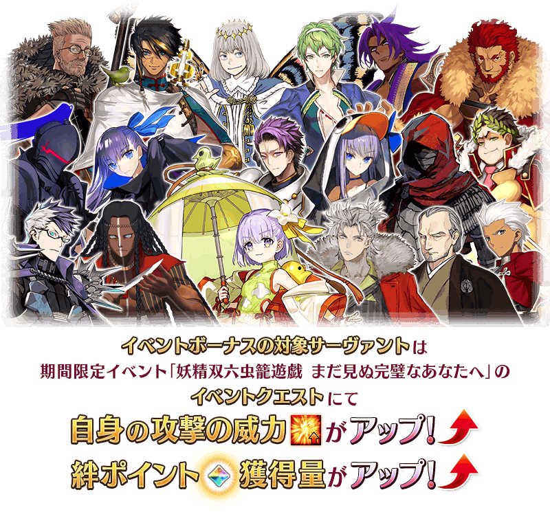 期間限定イベント「妖精双六虫籠遊戯 まだ見ぬ完璧なあなたへ」の期間中、一部のサーヴァントはイベントクエストにおける「自身の攻撃の威力がアップ」と「絆ポイント獲得量がアップ」のボーナスを得られます!