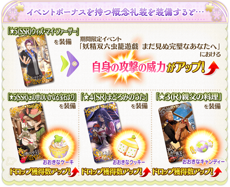 イベントアイテム交換およびイベント限定ミッション報酬で入手できるイベント限定概念礼装「★5(SSR)ウィズ・マイ・ファーザー」を装備することで、期間限定イベント「妖精双六虫籠遊戯 まだ見ぬ完璧なあなたへ」における自身の攻撃の威力がアップします。