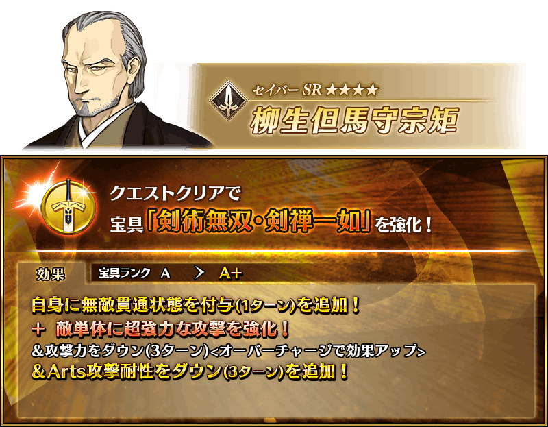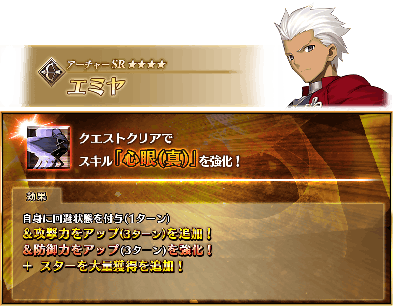 ※「★4(SR)柳生但馬守宗矩」は1つ目の強化クエストである「強化クエスト 柳生但馬守宗矩」をクリアする必要があります。 ※「★4(SR)エミヤ」は3つ目の強化クエストである「強化クエスト エミヤ 3」をクリアする必要があります。 ※サーヴァント強化クエストにはアドベンチャーパートはありませんのでご注意ください。 ※対象サーヴァントを所持していない場合、クエストは出現しません。 ※クエストに開催期限はありません。