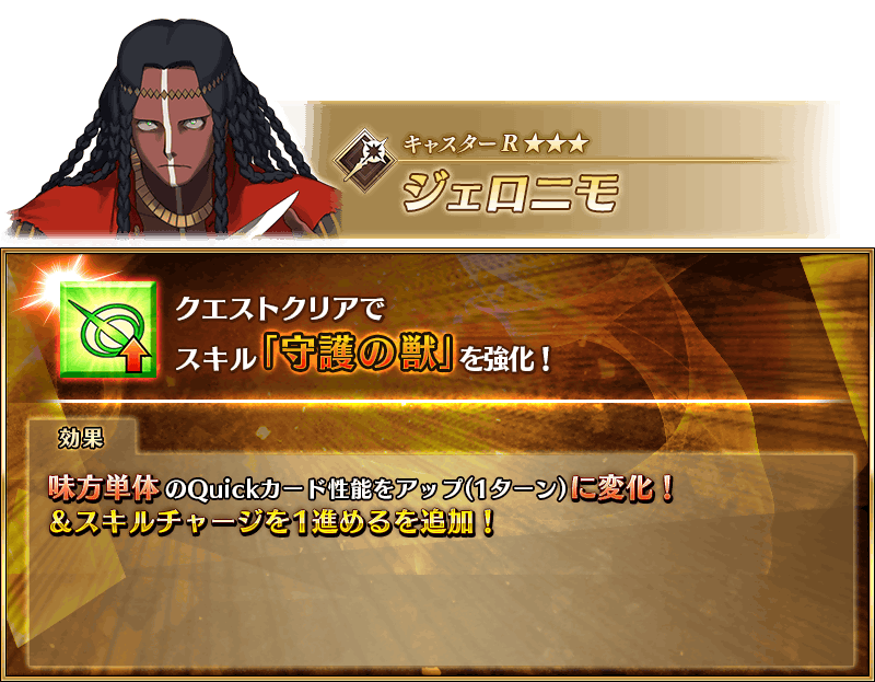 「★4(SR)柳生但馬守宗矩」「★4(SR)エミヤ」「★3(R)ジェロニモ」が強化される特別なクエスト「サーヴァント強化クエスト」が、カルデアゲートに恒常的に追加されます。