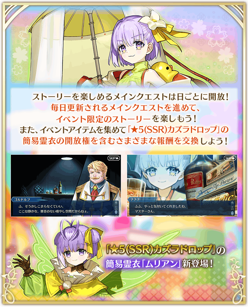 期間限定イベント「妖精双六虫籠遊戯 まだ見ぬ完璧なあなたへ」の報酬として、「★5(SSR)カズラドロップ」の簡易霊衣「ムリアン」の開放権が登場!