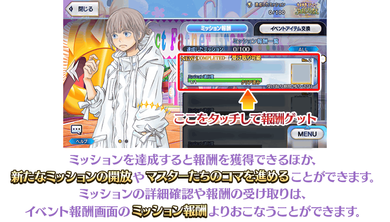 また、ミッションの達成状況に応じて新たなミッションが開放されていくほか、特定のミッションをクリアした際はマスターたちのコマを進めることができます。