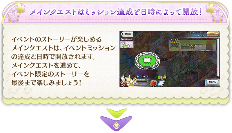 本イベントでは、チェックポイントマスに到達することで開放されるメインクエストをクリアすると、マスターに対する評価点が付けられます。