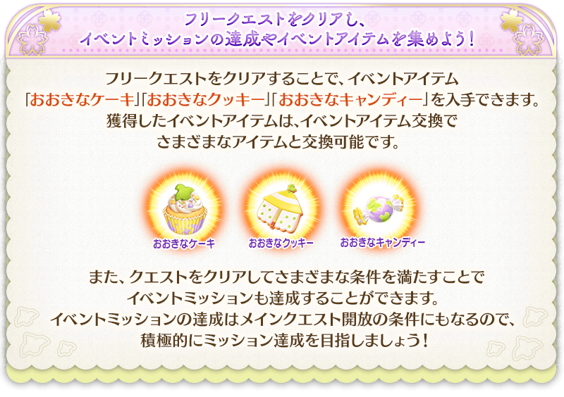 本イベントでは、ストーリーを楽しめるメインクエストが日ごとに開放されるほか、メインクエストをクリアしていくと、イベントアイテムを集められるフリークエストもあわせて開放されます。