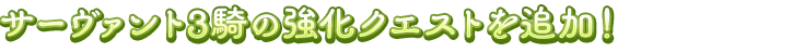 「★4(SR)柳生但馬守宗矩」「★4(SR)エミヤ」「★3(R)ジェロニモ」が強化される特別なクエスト「サーヴァント強化クエスト」が、カルデアゲートに恒常的に追加されます。