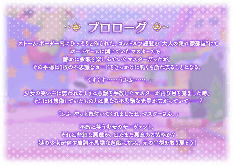 謎の少女の悪戯(?)によって身体を小さくされてしまったマスター。元の平穏を取り戻すため、少女が催す摩訶不思議な遊戯に挑もう!