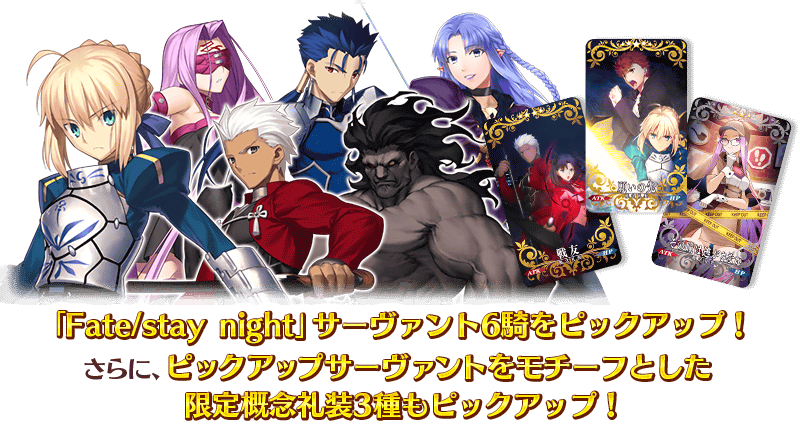 「Fate/stay night」20周年を記念して、「★5(SSR)アルトリア・ペンドラゴン(セイバー)」を含む「Fate/stay night」サーヴァント6騎と、ピックアップサーヴァントをモチーフとした期間限定概念礼装3種をピックアップ!