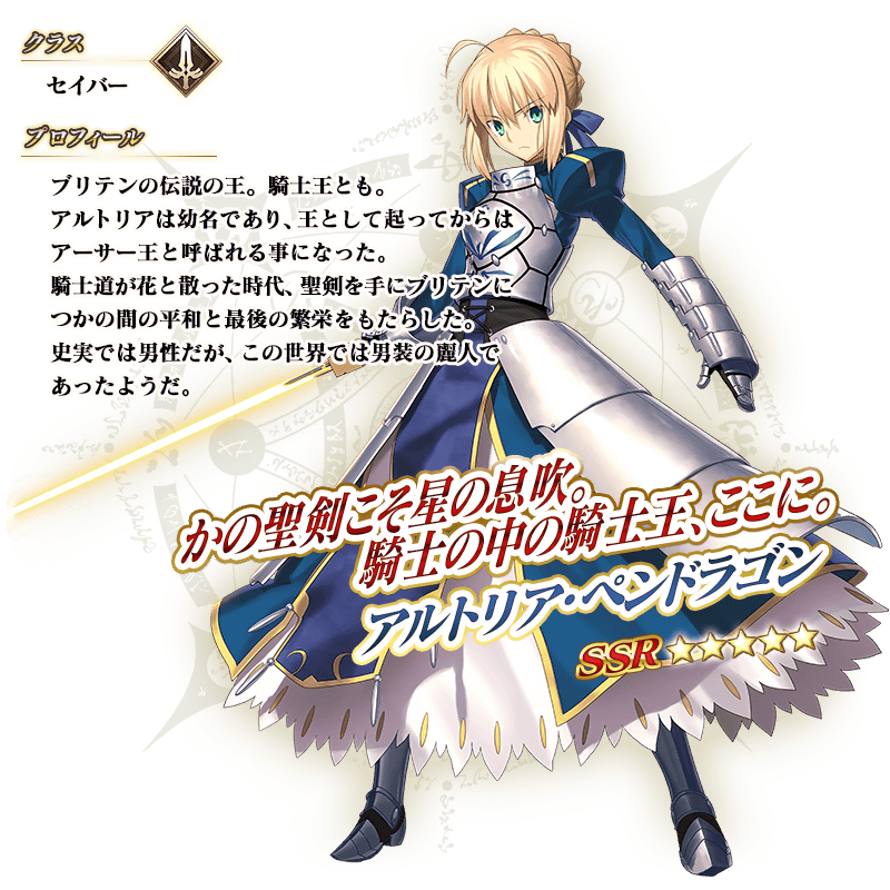 ※上記の「★5(SSR)アルトリア・ペンドラゴン(セイバー)」のイラストは霊基再臨第2段階のものです。