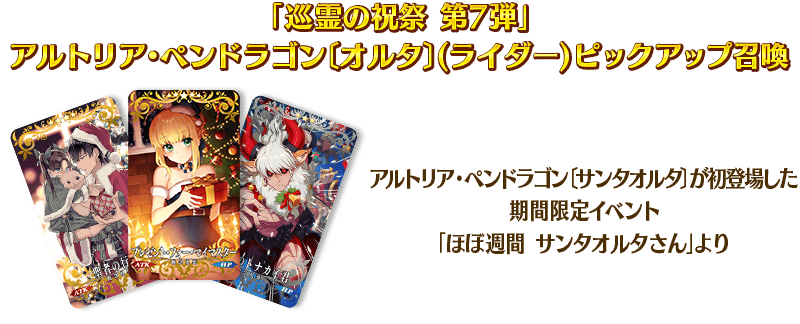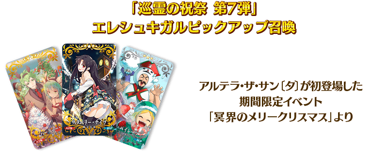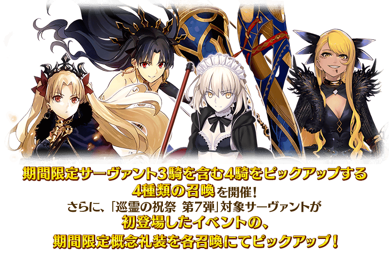 「巡霊の祝祭 第7弾」対象サーヴァントに関連するサーヴァントの中から、期間限定サーヴァント3騎を含む4騎をピックアップする4種類の召喚を開催いたします!