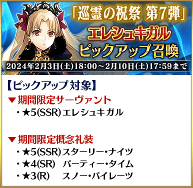 また、「巡霊の祝祭 第7弾」対象サーヴァントが初登場したイベントの、期間限定概念礼装を各召喚にてピックアップいたします!