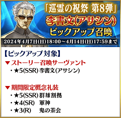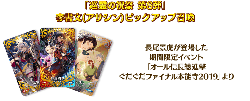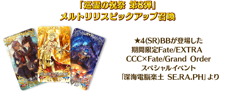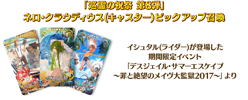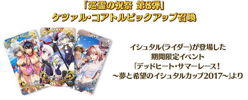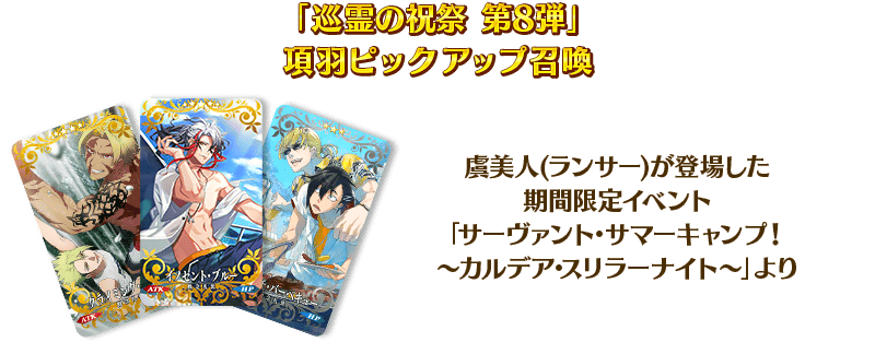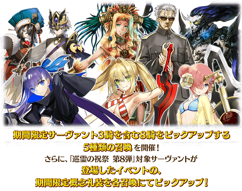 「巡霊の祝祭 第8弾」対象サーヴァントに関連するサーヴァントの中から、期間限定サーヴァント3騎を含む8騎をピックアップする5種類の召喚を開催いたします!