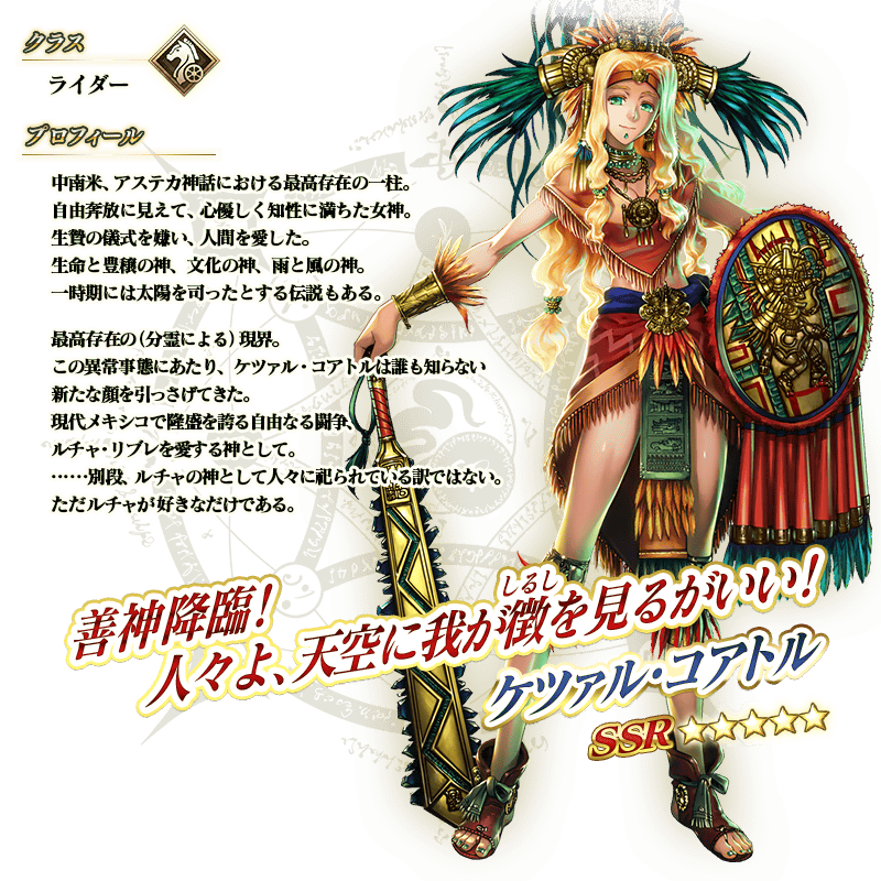 ※上記の「★5(SSR)ケツァル・コアトル」のイラストは霊基再臨第2段階のものです。