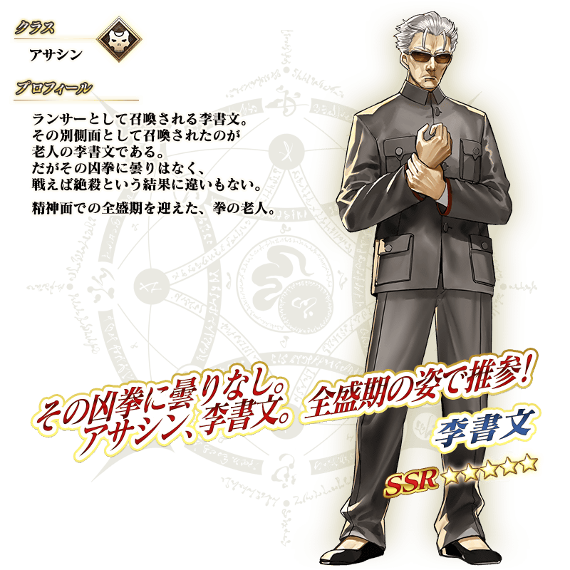 ※上記の「★5(SSR)李書文(アサシン)」のイラストは霊基再臨第2段階のものです。