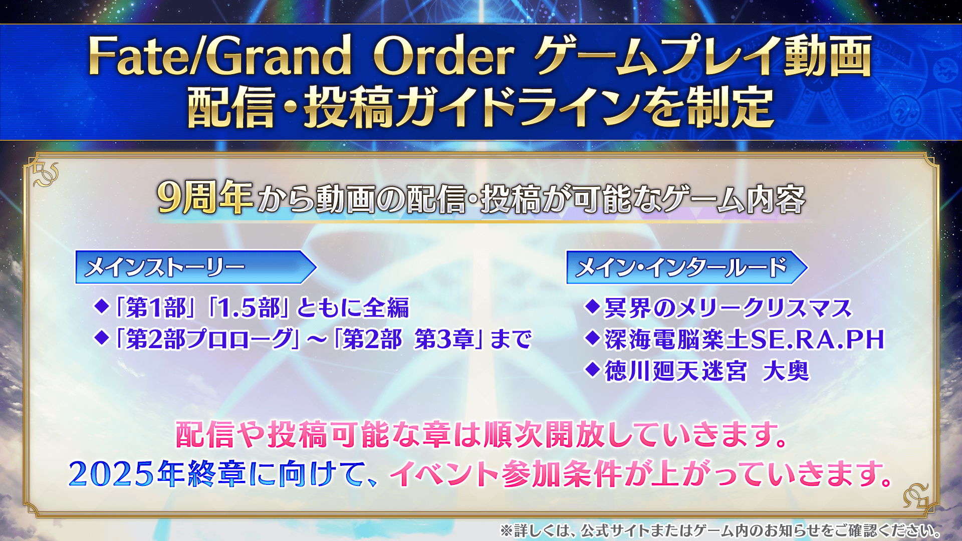 「第2部 終章」開幕に向けて「Fate/Grand Order」のゲームプレイ動画の配信・投稿が可能になりました。