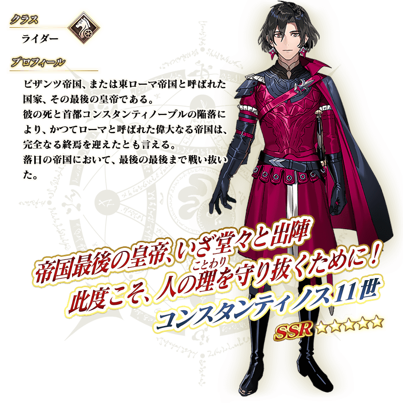 ※上記の「★5(SSR)コンスタンティノス11世」のイラストとセイントグラフは霊基再臨第2段階のものです。