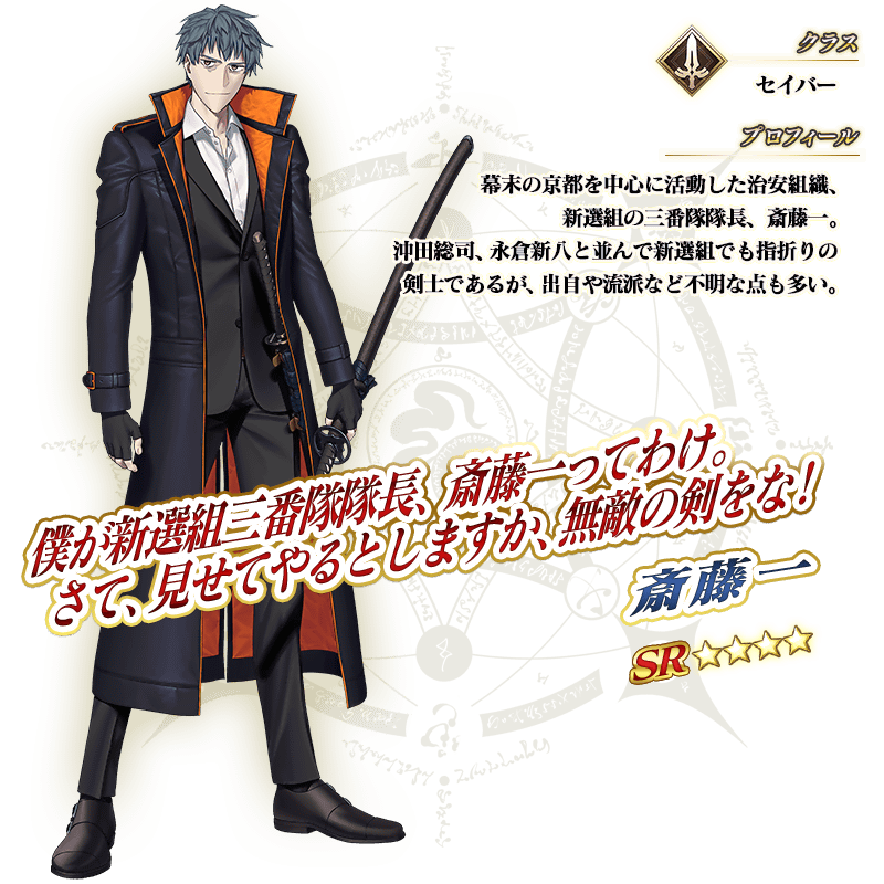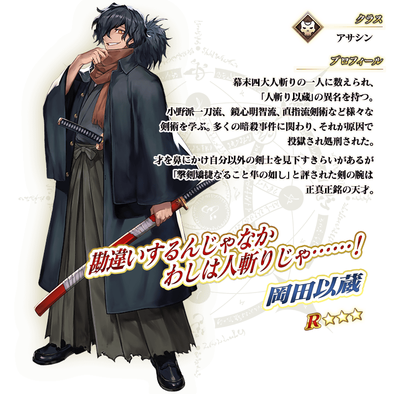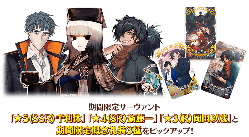 「京都国際マンガ・アニメフェア(京まふ)2024」への出展を記念して、期間限定サーヴァント「★5(SSR)千利休」「★4(SR)斎藤一」「★3(R)岡田以蔵」と、期間限定概念礼装3種をピックアップ!