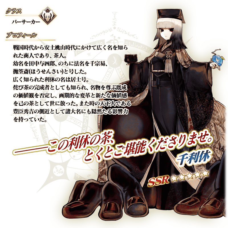 ※上記の「★5(SSR)千利休」のイラストとセイントグラフは霊基再臨第2段階のものです。