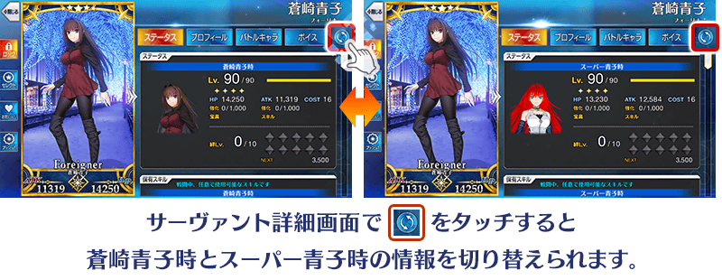 ※1~5枚目それぞれのコマンドカードの強化とコマンドコード刻印の状態は、変身前と変身後で同じ状態となります。 ※スキル1~3を強化した際は、変身前と変身後のスキルレベルが同時に強化されます。 ※一部のバトルではBGMが変化しない場合があります。