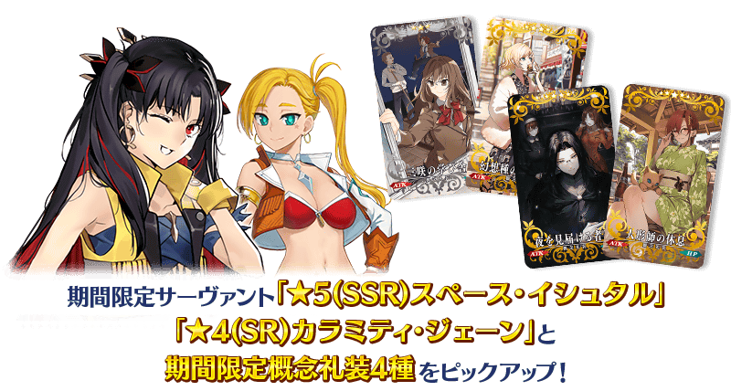 期間限定『魔法使いの夜×Fate/Grand Orderコラボレーションイベント「魔法使いの夜アフターナイト/隈乃温泉殺人事件 ~駒鳥は見た! 魔法使いは二度死ぬ~」』の開幕を記念して、期間限定サーヴァント「★5(SSR)スペース・イシュタル」「★4(SR)カラミティ・ジェーン」と、期間限定概念礼装4種をピックアップ!