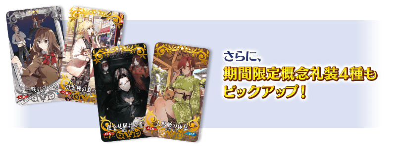 ピックアップ対象の期間限定概念礼装4種は、装備するとコラボレーションイベント「魔法使いの夜アフターナイト/隈乃温泉殺人事件 ~駒鳥は見た! 魔法使いは二度死ぬ~」におけるイベントアイテムのドロップ獲得数がアップします。