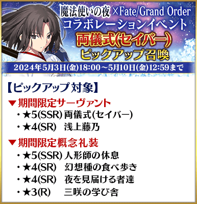 ◆「魔法使いの夜×Fate/Grand Orderコラボレーションイベントピックアップ4召喚」スケジュール◆