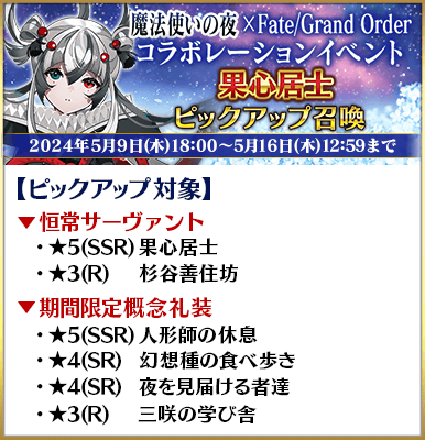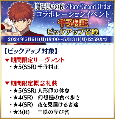期間限定『魔法使いの夜×Fate/Grand Orderコラボレーションイベント「魔法使いの夜アフターナイト/隈乃温泉殺人事件 ~駒鳥は見た! 魔法使いは二度死ぬ~」』の開幕を記念して、期間限定サーヴァント3騎を含む5騎と、期間限定概念礼装4種をピックアップする3種類の召喚を開催いたします!