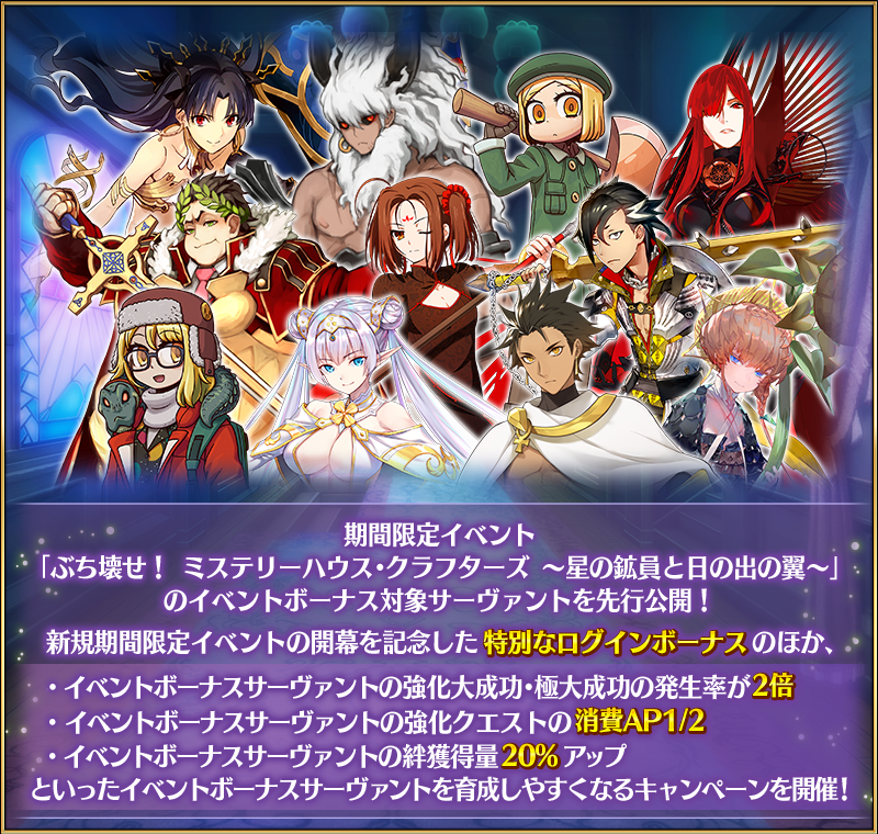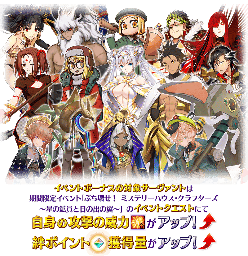 期間限定イベント「ぶち壊せ! ミステリーハウス・クラフターズ ~星の鉱員と日の出の翼~」の期間中、一部のサーヴァントはイベントクエストにおける「自身の攻撃の威力がアップ」と「絆ポイント獲得量がアップ」のボーナスを得られます!