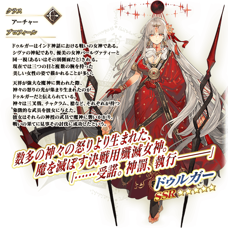 ※上記の「★5(SSR)ドゥルガー」のイラストは霊基再臨第2段階のものです。 ※「★5(SSR)ドゥルガー」の宝具は、霊基再臨第3段階のバトルキャラに変化した際、名称と演出が変わります。