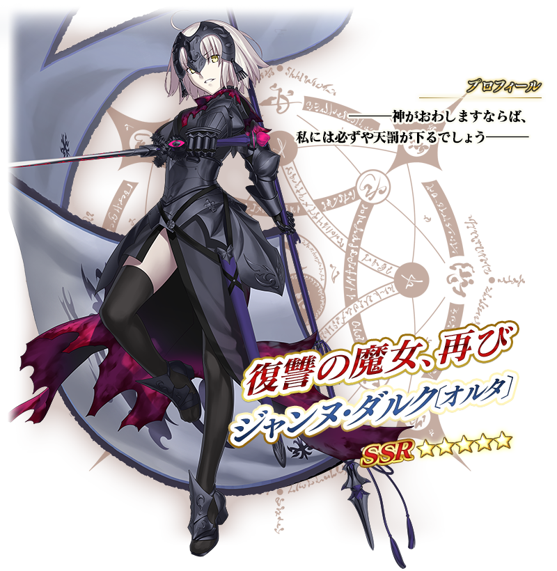 ※上記の「★5(SSR)ジャンヌ・ダルク〔オルタ〕(アヴェンジャー)」のセイントグラフとイラストは霊基再臨第2段階のものです。