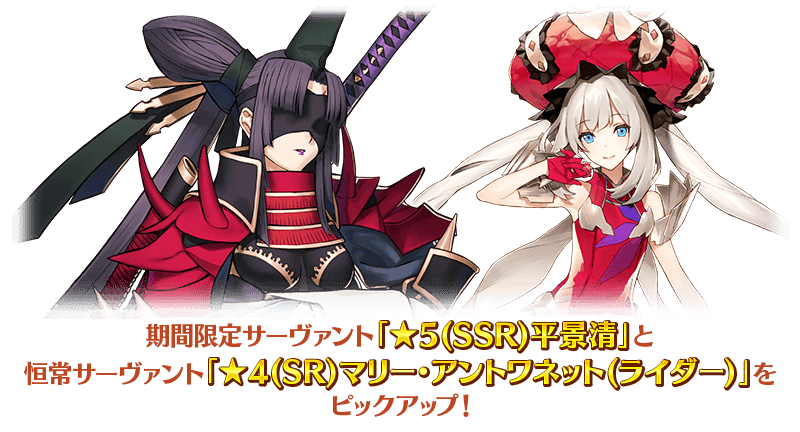 「奏章Ⅱ 不可逆廃棄孔 イド」の開幕を記念して、期間限定サーヴァント「★5(SSR)平景清」と、恒常サーヴァント「★4(SR)マリー・アントワネット(ライダー)」をピックアップ!