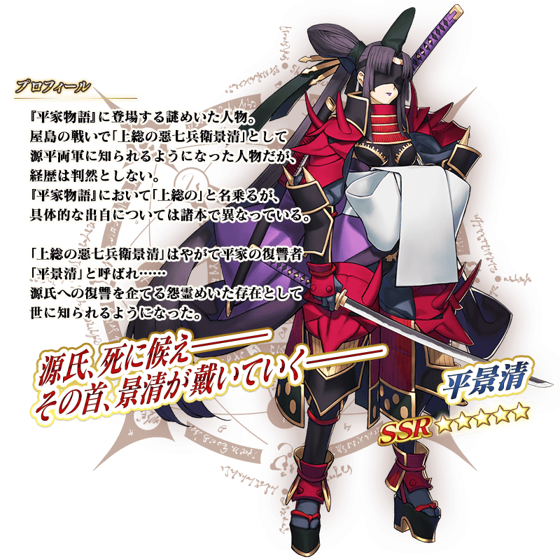 ※上記の「★5(SSR)平景清」のセイントグラフとイラストは霊基再臨第2段階のものです。