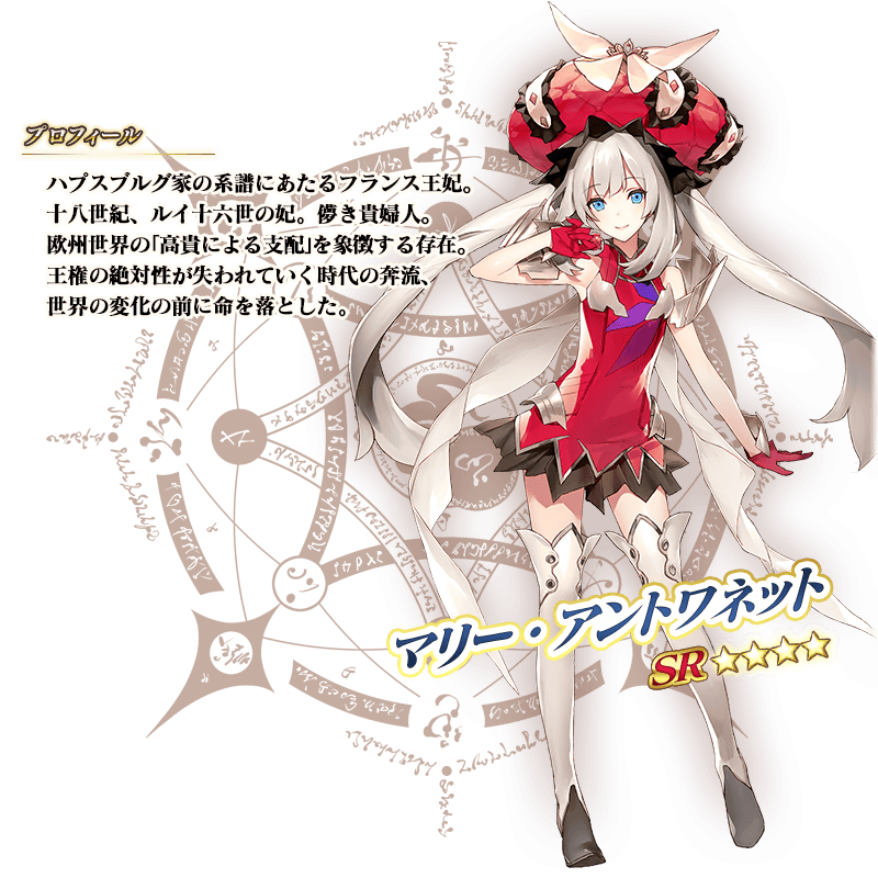 ※上記の「★4(SR)マリー・アントワネット(ライダー)」のセイントグラフとイラストは霊基再臨第2段階のものです。