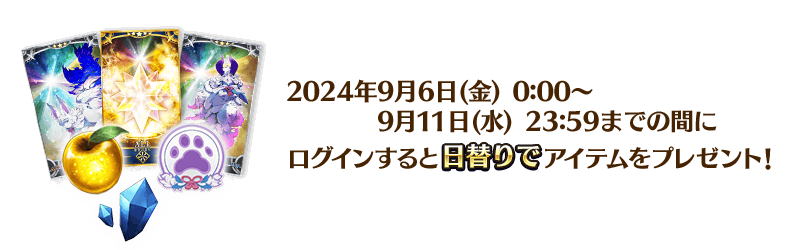 9月6日(金) 0:00からのログインボーナスとして、さまざまなアイテムを日替りでプレゼント!