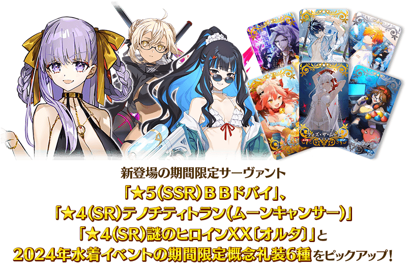 期間限定「奏章Ⅲ 新霊長後継戦 アーキタイプ・インセプション」の開幕を記念して、新登場の期間限定サーヴァント「★5(SSR)BBドバイ」「★4(SR)テノチティトラン(ムーンキャンサー)」「★4(SR)謎のヒロインXX〔オルタ〕」と、2024年水着イベントの期間限定概念礼装6種をピックアップ!