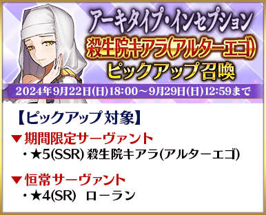 「★5(SSR)殺生院キアラ(アルターエゴ)」が強化される特別なクエスト「サーヴァント強化クエスト」が、カルデアゲートに恒常的に追加されます。