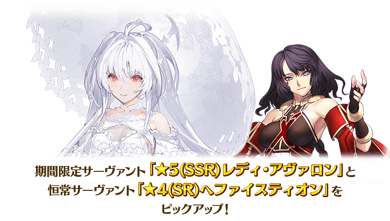 「オーディール・コール」の新任務開放を記念して、期間限定サーヴァント「★5(SSR)レディ・アヴァロン」と恒常サーヴァント「★4(SR)ヘファイスティオン」をピックアップする召喚を開催!