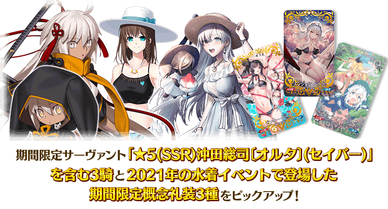 期間限定イベント「カルデア・サマーアドベンチャー! ~夢追う少年と夢見る少女~ アンケート復刻版」の開幕を記念して、期間限定サーヴァント「★5(SSR)沖田総司〔オルタ〕(セイバー)」を含む3騎と、2021年の水着イベントで登場した期間限定概念礼装3種をピックアップ!