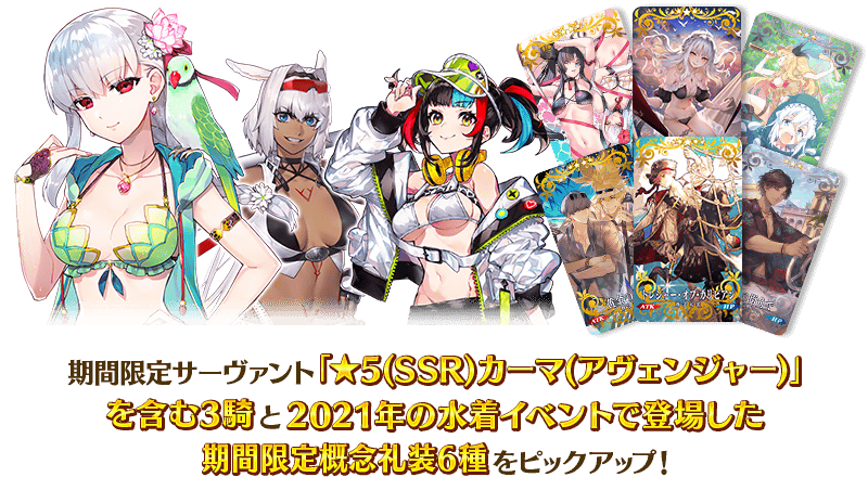 期間限定イベント「カルデア・サマーアドベンチャー! ~夢追う少年と夢見る少女~ アンケート復刻版」の開幕を記念して、期間限定サーヴァント「★5(SSR)カーマ(アヴェンジャー)」を含む3騎と2021年の水着イベントで登場した期間限定概念礼装6種をピックアップ!