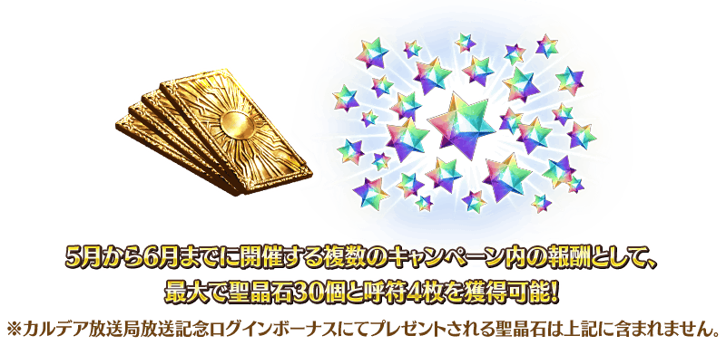 また本キャンペーン以外にも複数のキャンペーンの開催を予定しており、5月から6月までに開催するキャンペーン内の報酬として最大で聖晶石30個と呼符4枚が獲得可能となります。 ※上記の聖晶石の数は、キャンペーン第1弾と第2弾での報酬を含みます。