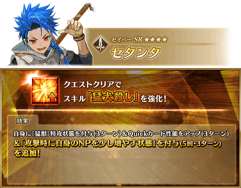 さらに、エピローグをクリアすると、イベント限定の配布サーヴァント「★4(SR)セタンタ」の宝具強化専用霊基を獲得できるクエストが出現します。