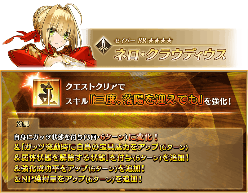 ※「★4(SR)ネロ・クラウディウス(セイバー)」は2つ目の強化クエストである「強化クエスト ネロ・クラウディウス 2」および幕間の物語 第3節をクリアしておく必要があります。 ※対象サーヴァントを所持していない場合、クエストは出現しません。 ※クエストに開催期限はありません。 ※サーヴァント強化クエストにはアドベンチャーパートはありませんのでご注意ください。