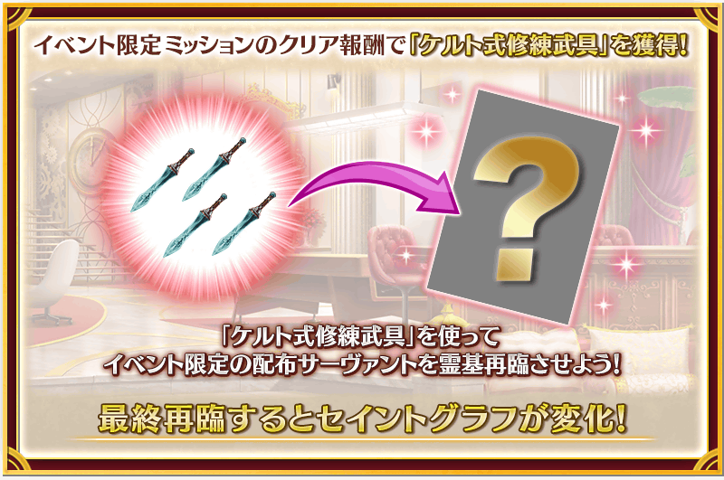 イベント限定ミッションのクリア報酬で、セタンタの霊基再臨に必要な「ケルト式修練武具」を入手できます。