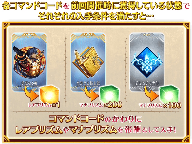 ・前回開催時に「コマンドコード」を獲得している場合、レアプリズムまたはマナプリズムに報酬が置き換えられます。