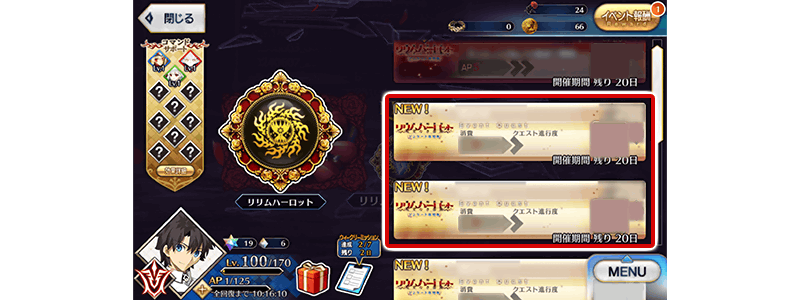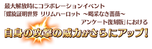 コラボレーションイベント「螺旋証明世界 リリムハーロット ~喝采なき薔薇~ アンケート復刻版」のすべてのイベント限定ミッション、および「終局特異点」をクリアしたマスターを対象とした、高難易度の「チャレンジクエスト」が開放されます。